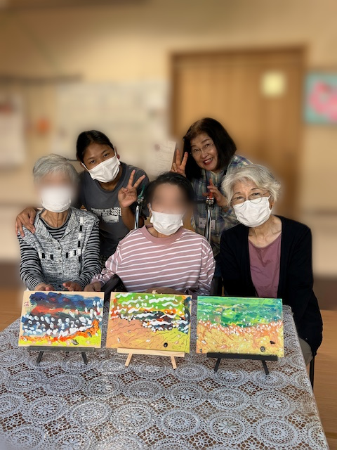 9月の臨床美術アートは『海岸線』海なし県に住んでいらっしゃる昔のお嬢様たち。それでも、海の思い出はそれぞれにあるようで、そんな思い出の海を思い浮かべて海岸線を仕上げました。
