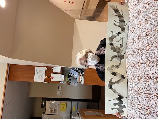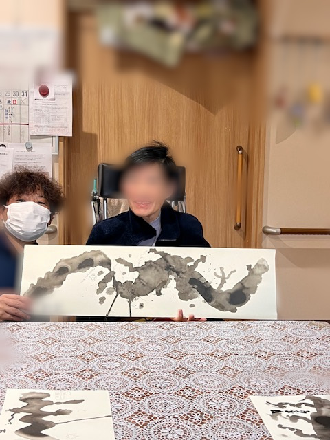 川の流れに想いをはせて、美空ひばりさんの「川の流れのように」を皆さんで歌いました。描く用紙は、それまた川のように長いなが~い紙!